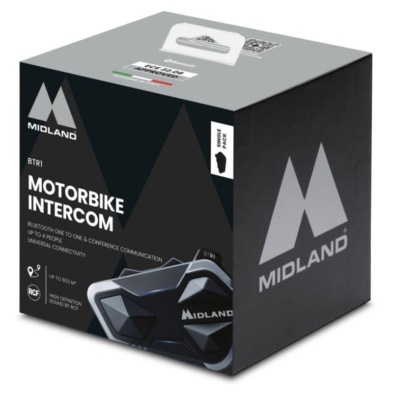 Interkomy Midland: stabilna komunikacja kierowca–pasażer i w grupie, Bluetooth, redukcja hałasu, tryby konferencyjne, komendy głosowe, integracja z nawigacją i smartfonem.